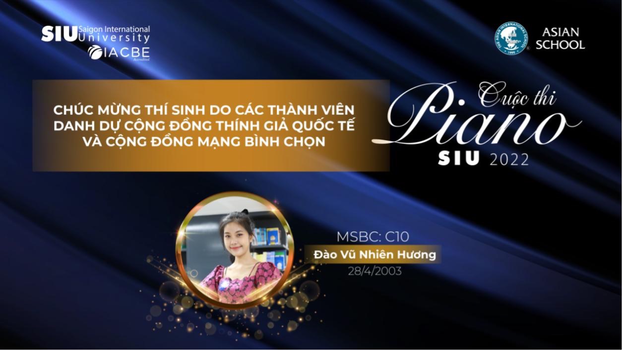 Vòng Chung kết Bảng C Cuộc thi Piano SIU 2022 diễn ra vào lúc 14:00 ngày 04/8/2022 tại Nhà hát Diên Hồng, Đông A Campus Trường Đại học Quốc tế Sài Gòn (SIU) – số 18 Tống Hữu Định, Phường Thảo Điền, Tp.Thủ Đức, TPHCM.